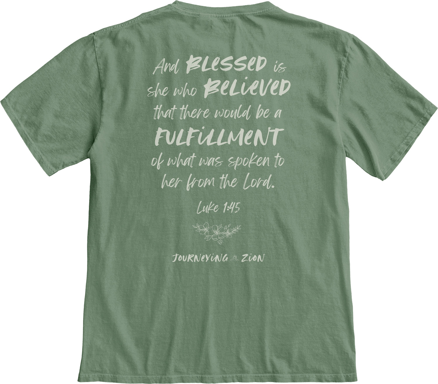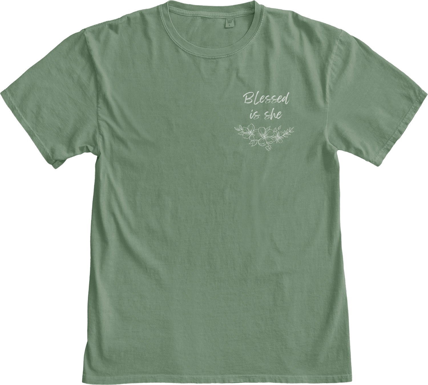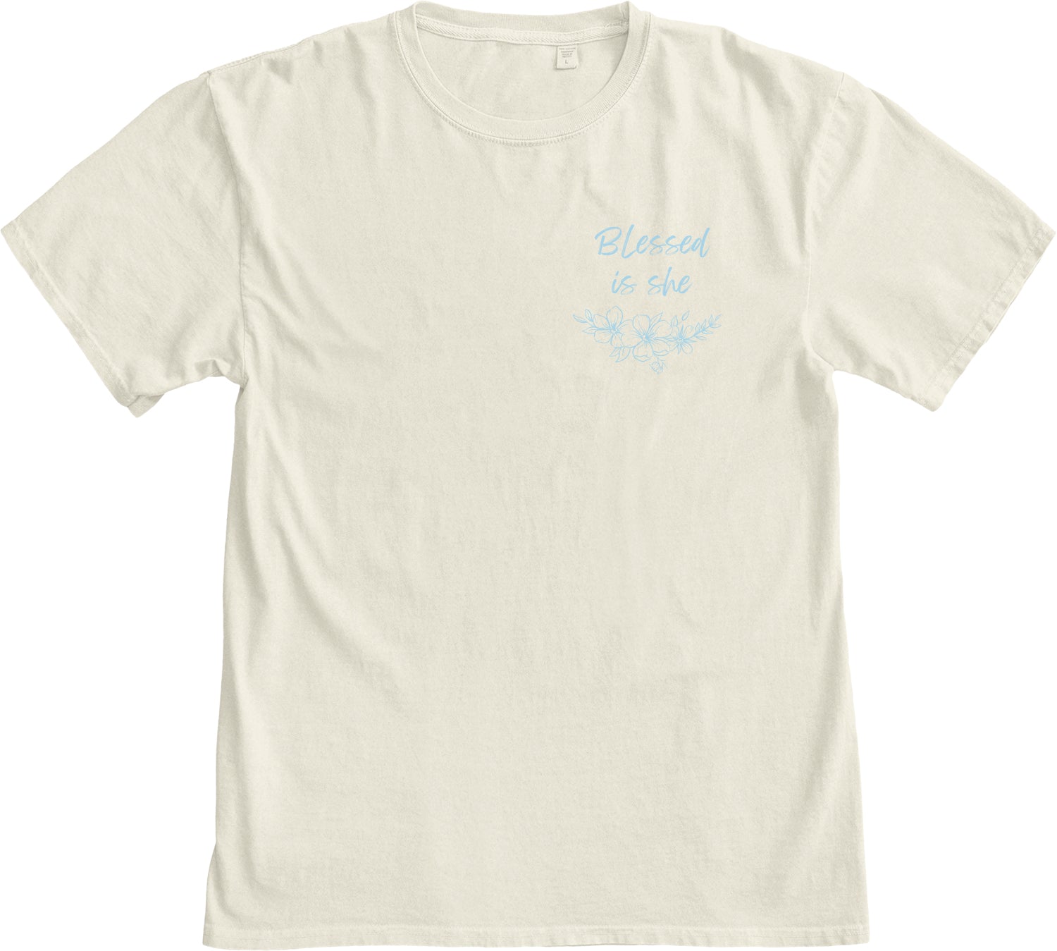 Verse on the back. "Blessed is she" on the front left chest.